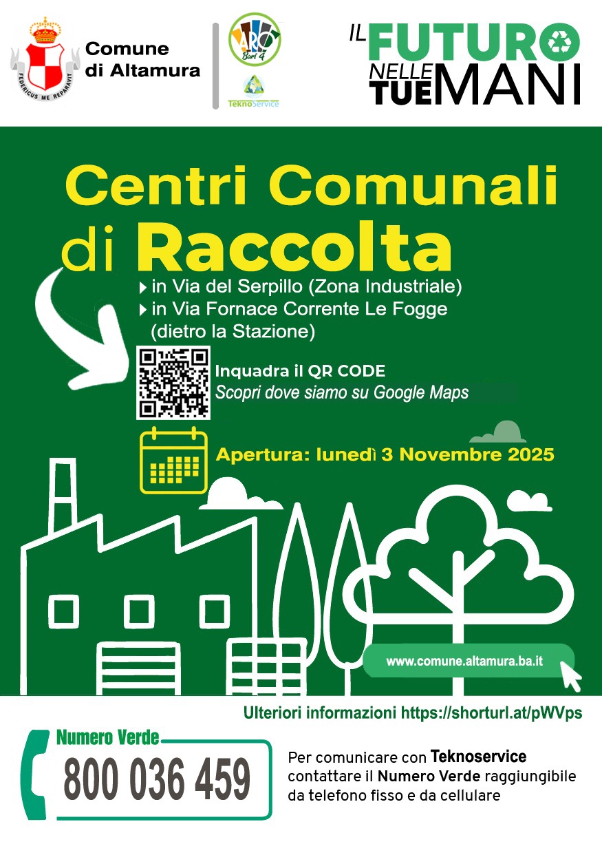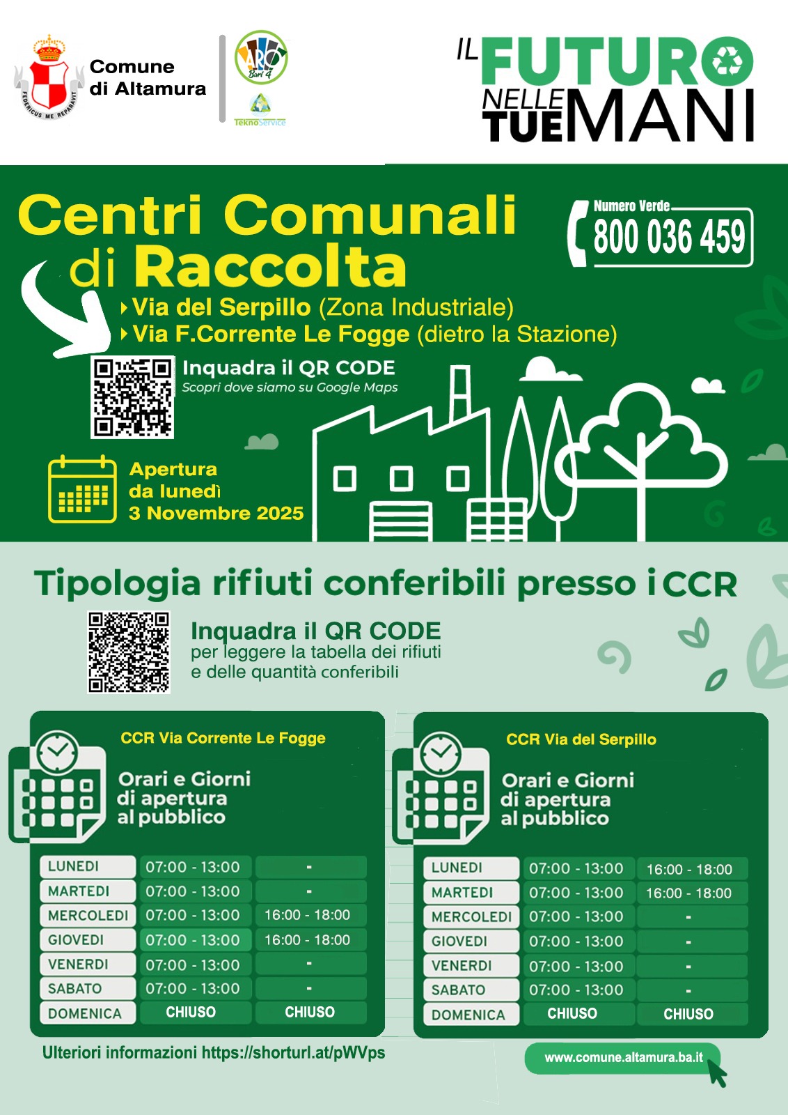 A partire dal 3 novembre 2025 saranno aperti al pubblico i due CCR (Centri comunali di raccolta), adibiti al conferimento di particolari tipologie di rifiuti. I centri sono ubicati in Via Corrente Le Fogge (zona artigianale Grotta Formica) e in via del Serpillo (zona industriale in via Gravina) e saranno gestiti da personale Teknoservice.