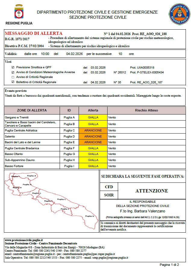 La Protezione civile della Regione Puglia ha emesso messaggi di allerta, di colore giallo, con validità nel giorno 4 febbraio 2026 con la previsione di forti venti e di precipitazioni.