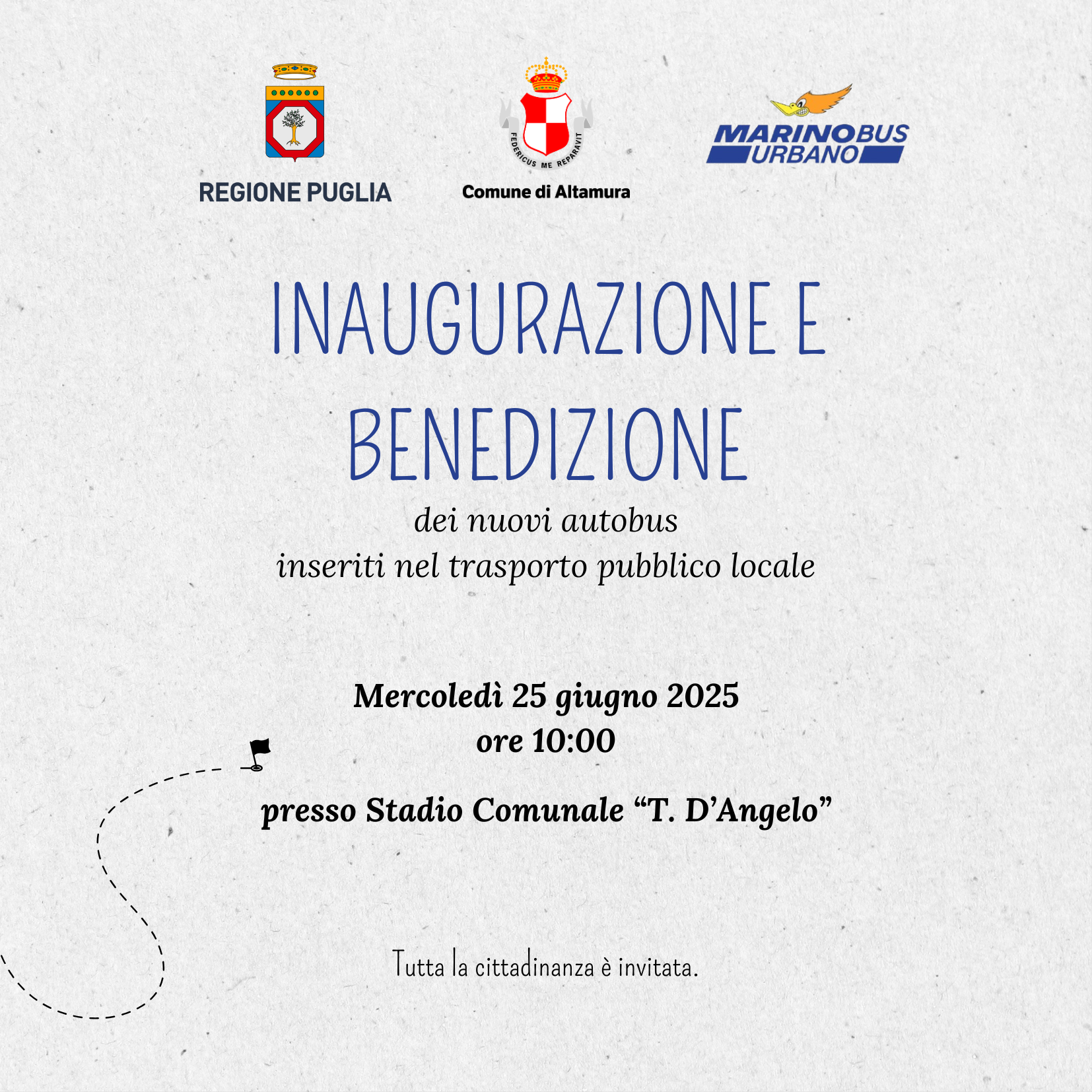 Il momento inaugurativo e di benedizione si terrà il giorno 25 giugno 2025, alle ore 10:00, presso lo Stadio Comunale “T. D'Angelo” di Altamura. Tutta la cittadinanza è invitata.