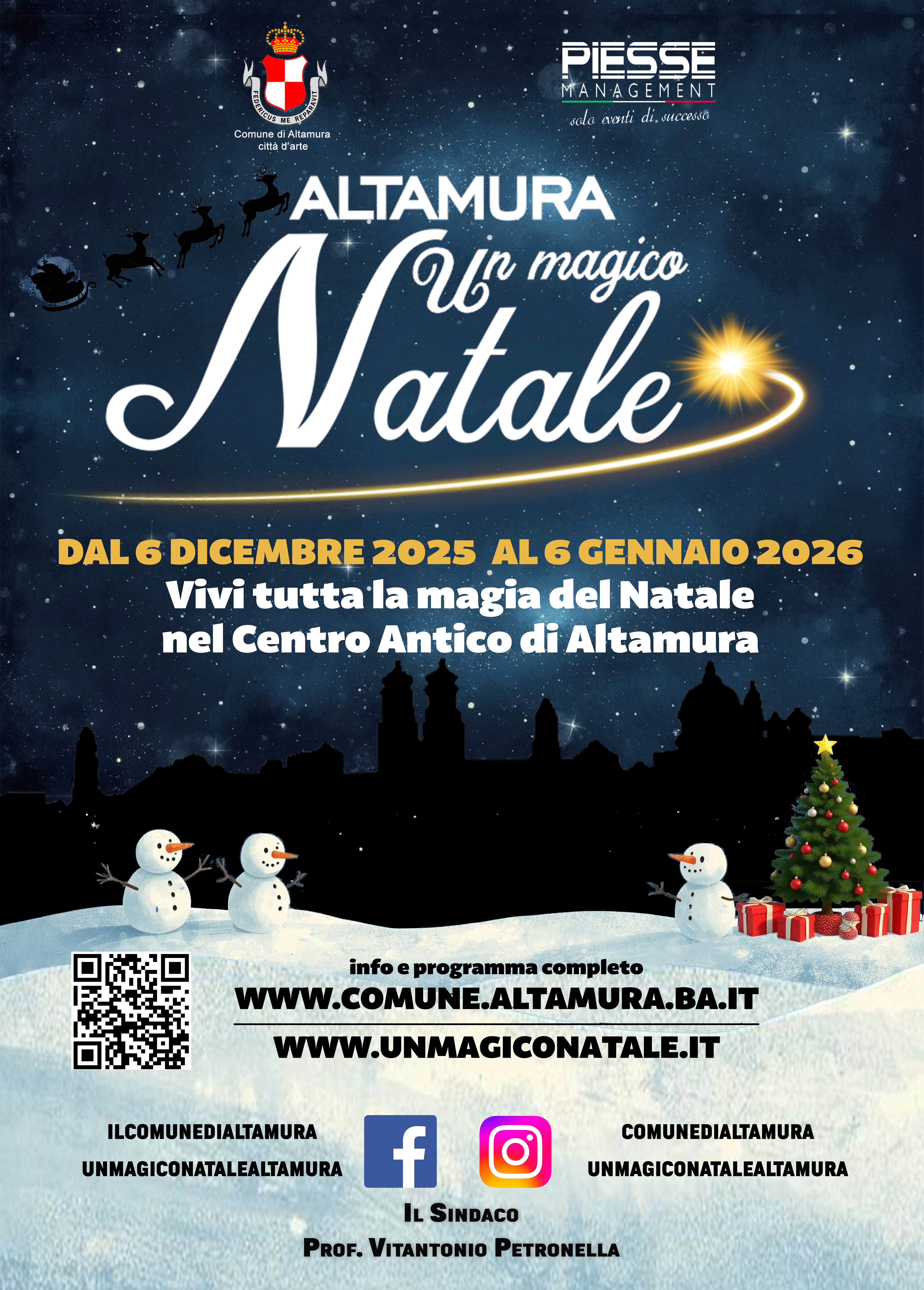 Dal 6 dicembre 2025 al 6 gennaio 2026 in programma "Un magico Natale", calendario di appuntamenti ed eventi promosso dall'Amministrazione comunale. Spettacoli, animazioni, concerti ed eventi per vivere tutta la magia del Natale.